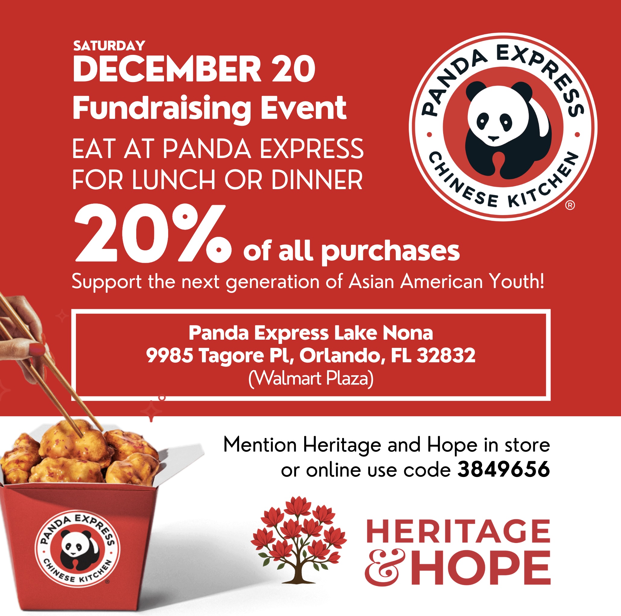 On Friday, December 20, 20% of all purchases at Panda Express Lake Nona will go directly to Heritage and Hope. Just mention “Heritage and Hope” when you check out at the register.